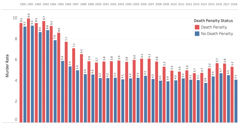 Since 1990, death penalty states have consistently had higher murder rates than non-death penalty states. In fact, the gap has grown over time. Those who support the abolition of the death penalty use this statistic as evidence that capital punishment does not keep society safer in any way, nor does it deter criminals from committing murder.
